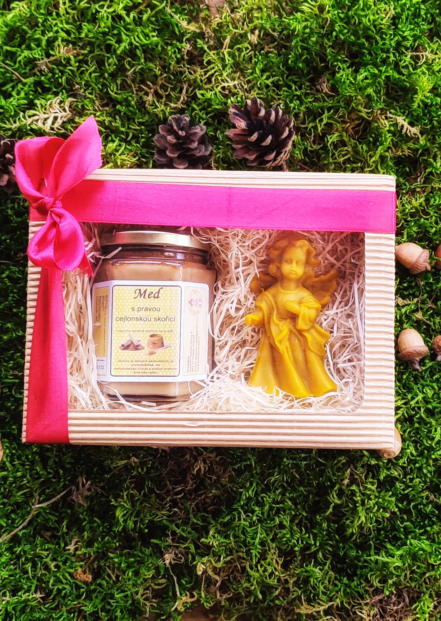 Obsah dárkového balíčku: Med s pravou cejlonskou skořicí 380g a vánoční svíčka