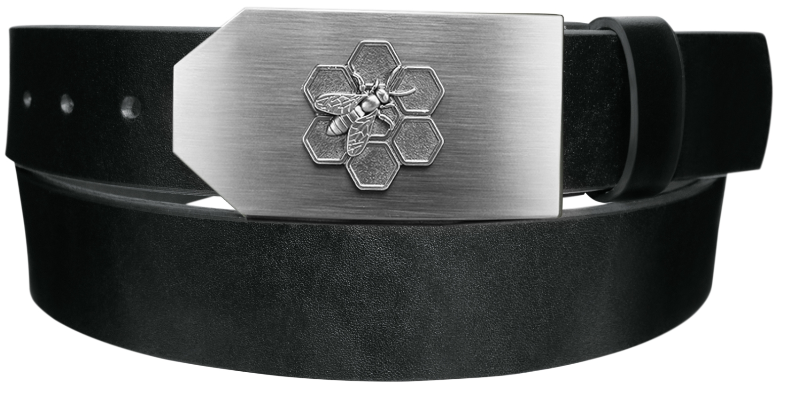 Nová, masivní kovová přezka s ostře řezanými rysy obsahuje 3D motiv včelaři. Atraktivní vzhled podtrhuje luxusní povrchová úprava starostříbro (ruční patinace). Zubový mechanismus přezky umožňuje velmi snadné zkrácení koženého opasku podle potřeby zákazníka. Základní délka opasku umožňuje rozsah použití až do 115 cm v pase. Pro větší objem v pasu je nutné vybrat nadměrnou délku, která má rozsah až do 125 cm v pase. Měření potřebného objemu v pase měřte VŽDY v místě, kde nosíte kalhoty (rozdíl objemu v pase a přes boky je značný). Šířka opasků je 4 cm, tloušťka kůže bývá v rozsahu 3,5 - 4 mm.