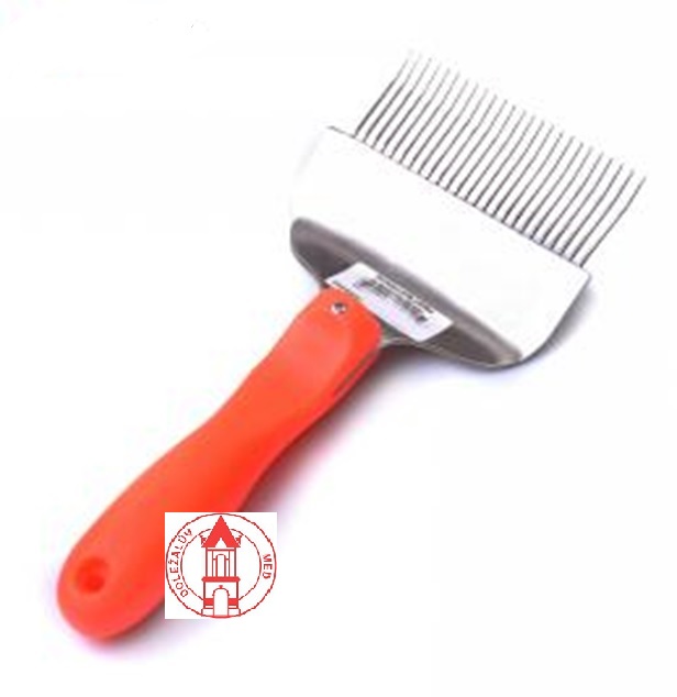 Profi odvíčkovací včelařská nerez vidlička 2x lomená, široká s nožem. Kvalitní nerez odvíčkovací vidlička má 25 jehel a šířka záběru je 9,5 cm. Jedná se o profesionální odvíčkovací vidličku, kterou má na svědomí český výrobce. Vidlička skvěle padne svou ergonomickou červenou rukojetí. Vidlička má navíc praktický nůž vhodný k odstranění propolisu. Včelařská odvíčkovací vidlička je neoddělitelnou součástí včelařského vybavení. Široká vidlička s 25 nerez jehlami slibuje rychlou a spolehlivou práci.
