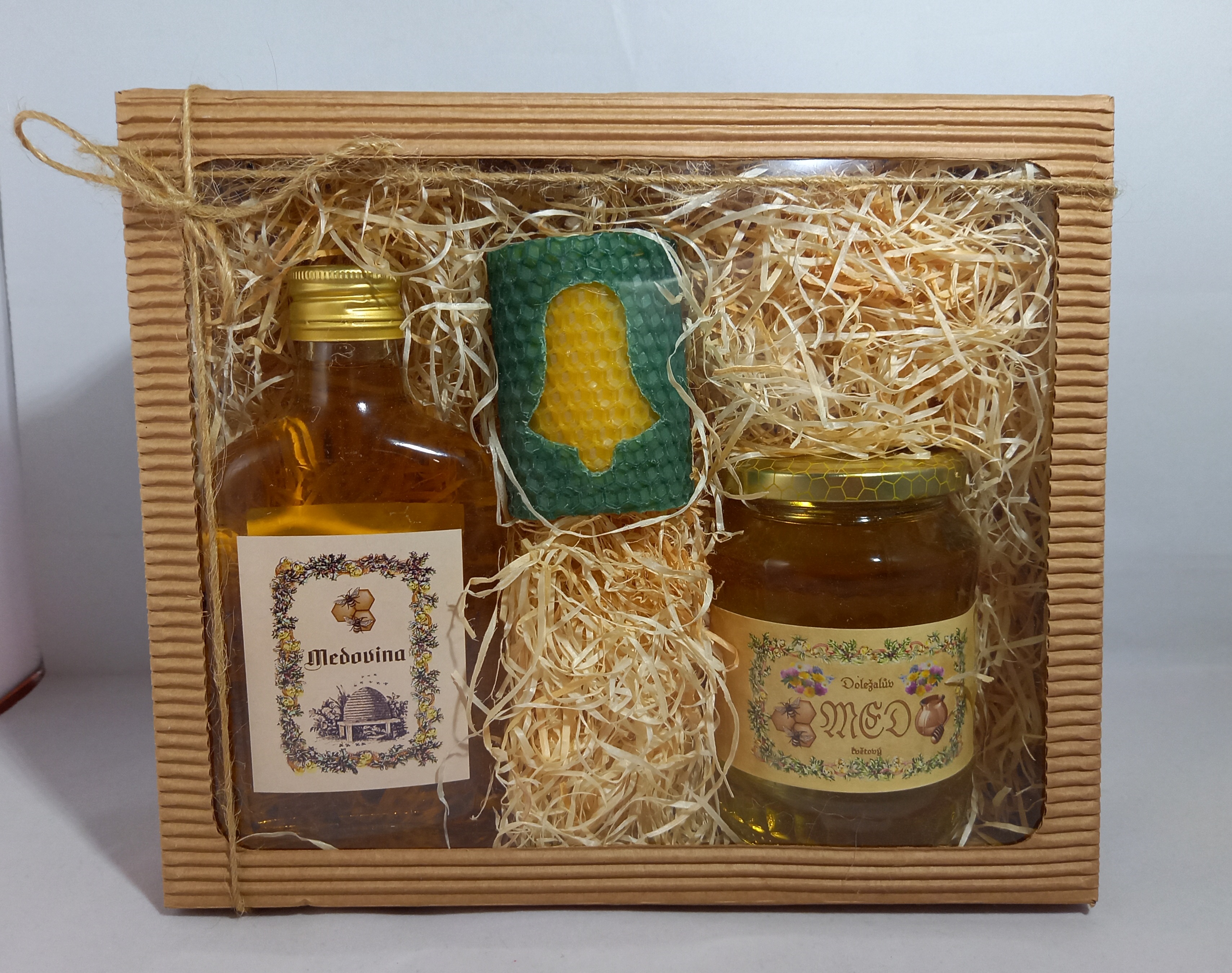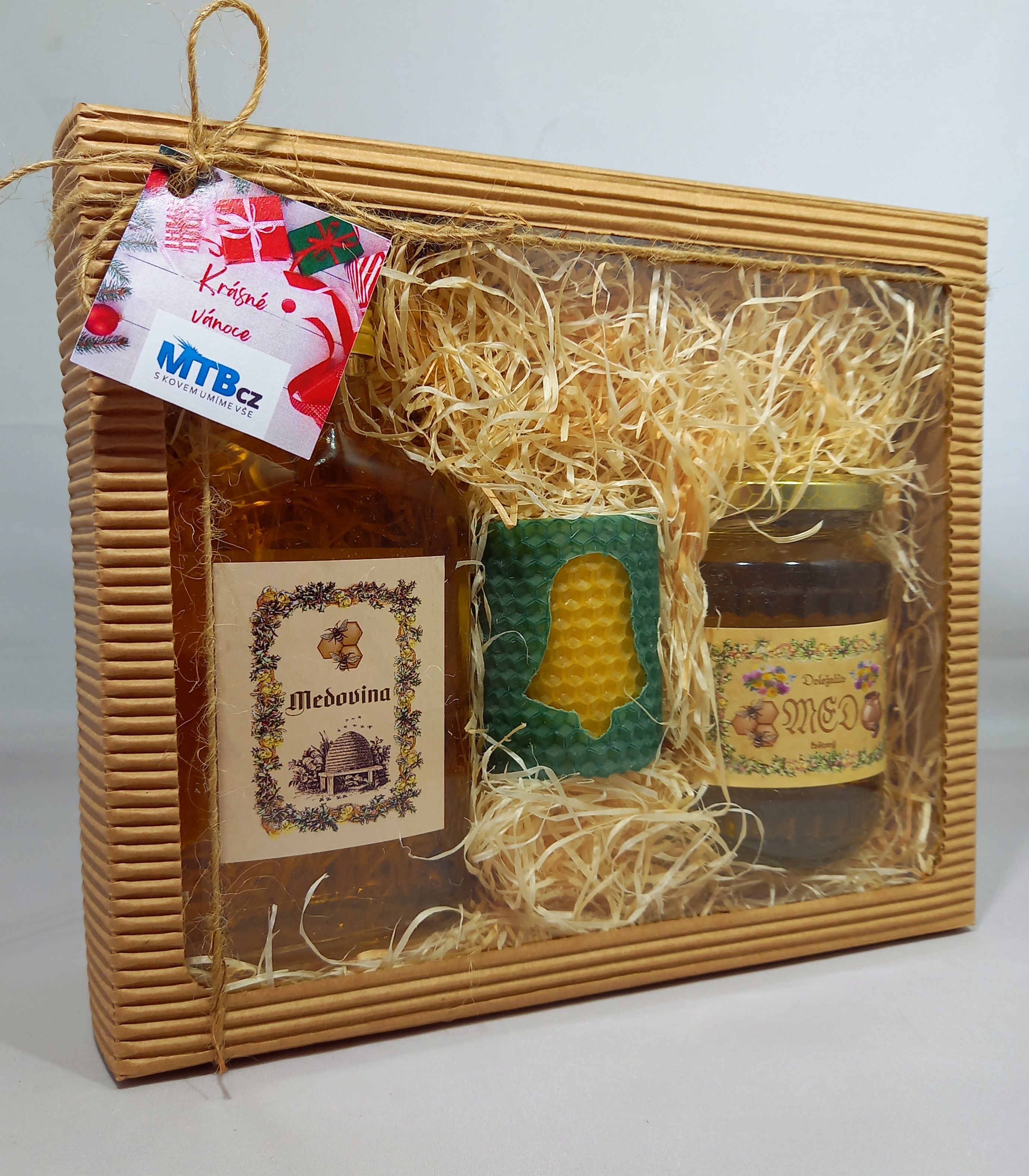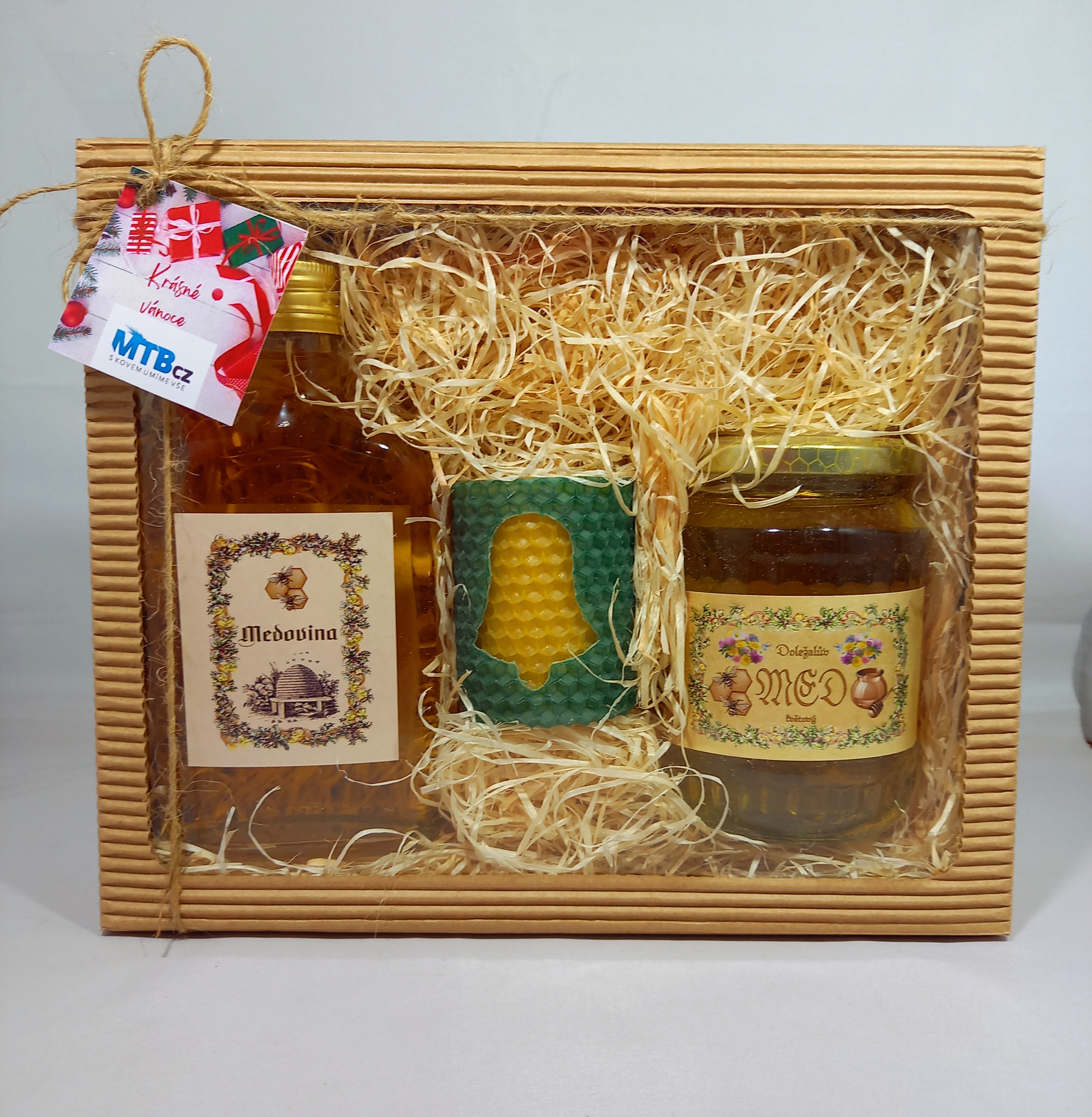 Obsah dárkového balíčku: Med květový 480g, Medovina 0,2l a a vánoční svíčka motaná