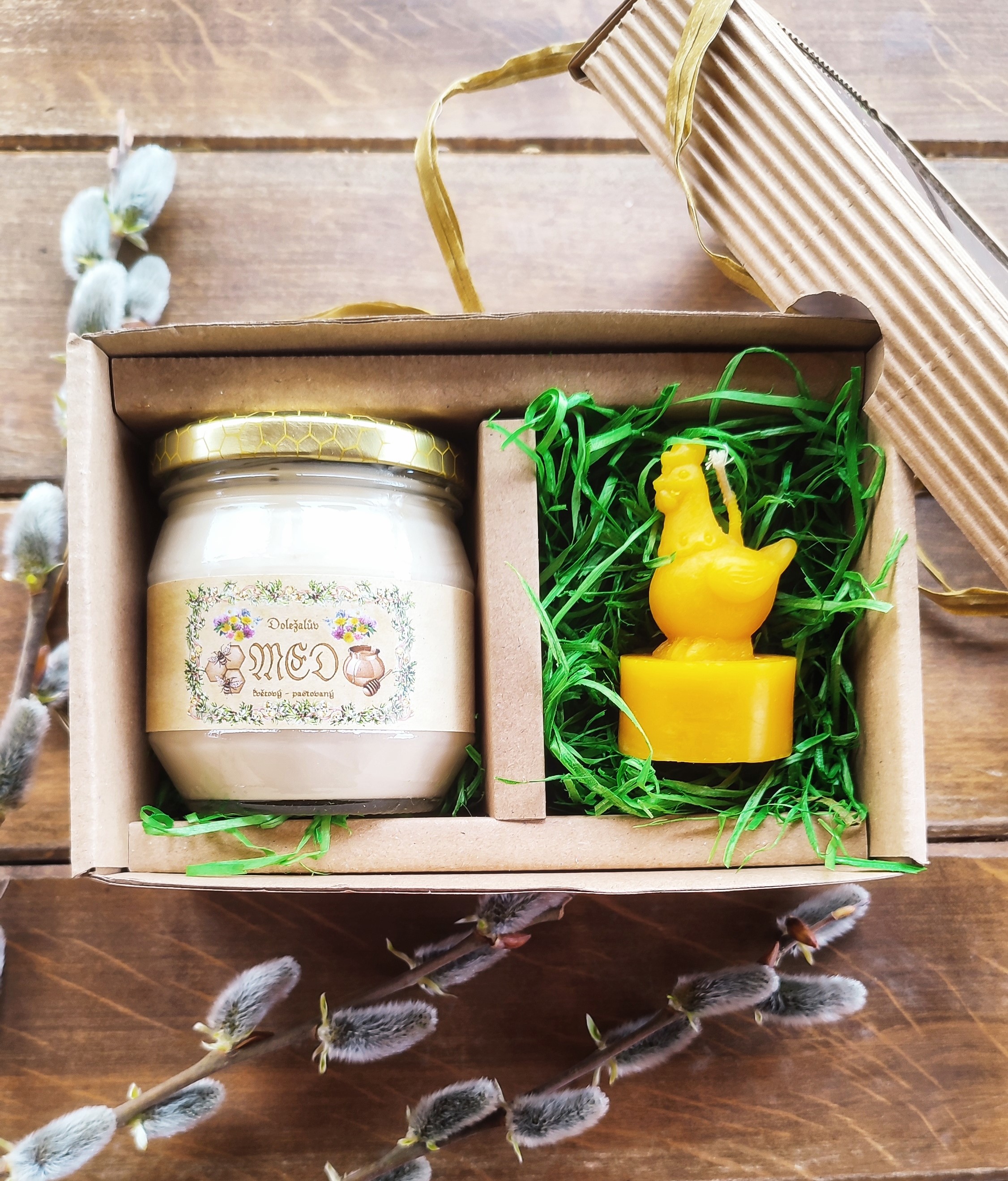 Spojení medu a svíčky s velikonoční tematikou je skvělým způsobem, jak překvapit každého koledníka. Naše dárkové balíčky, obsahující květový med (280g) nebo pastový med (280g), spolu s jemně vonící svíčkou ze včelího vosku dodají Vašemu domovu příjemnou velikonoční atmosféru.