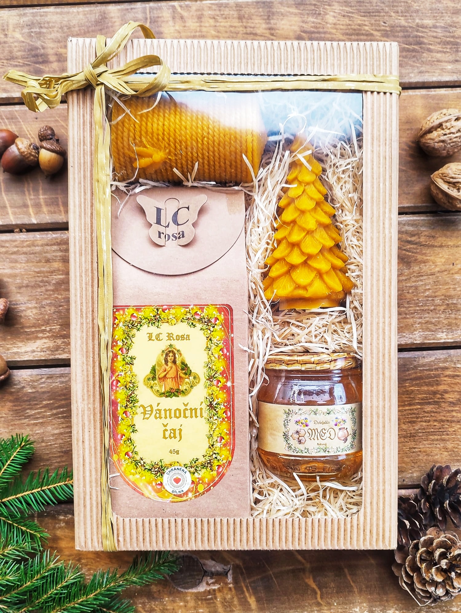 Obsah dárkového balíčku: Dárkové balení VIP Vánoční - Med květový 280g, Vánoční čaj a 2 svíčky ze včelího vosku, jedna s motivem včelky a druhá ve tvaru šišky.