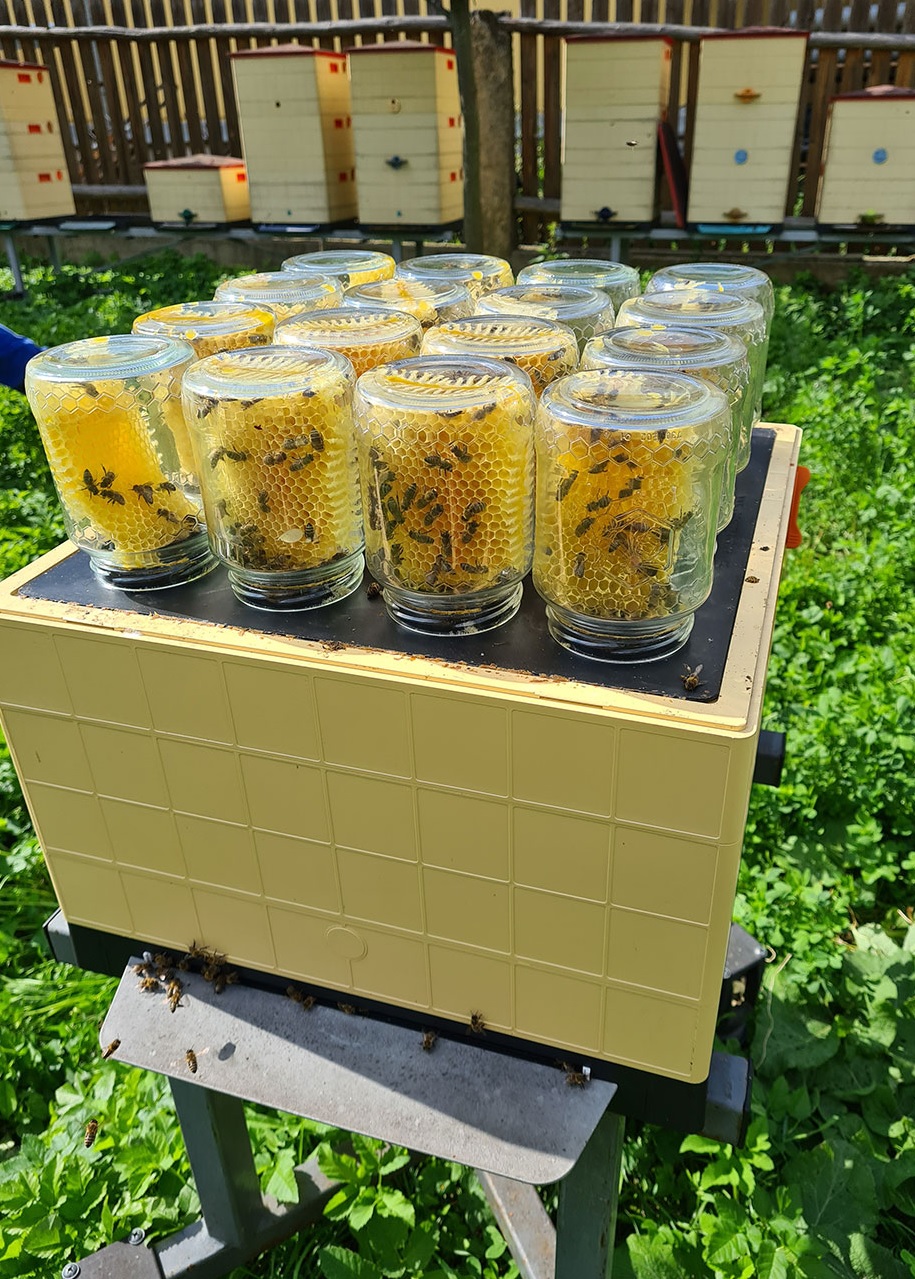 Nástavec / Kulisa na plástečkový med přímo do sklenic je určena k nasazení na nástavek a získaní plástečkového medu přímo do sklenice.